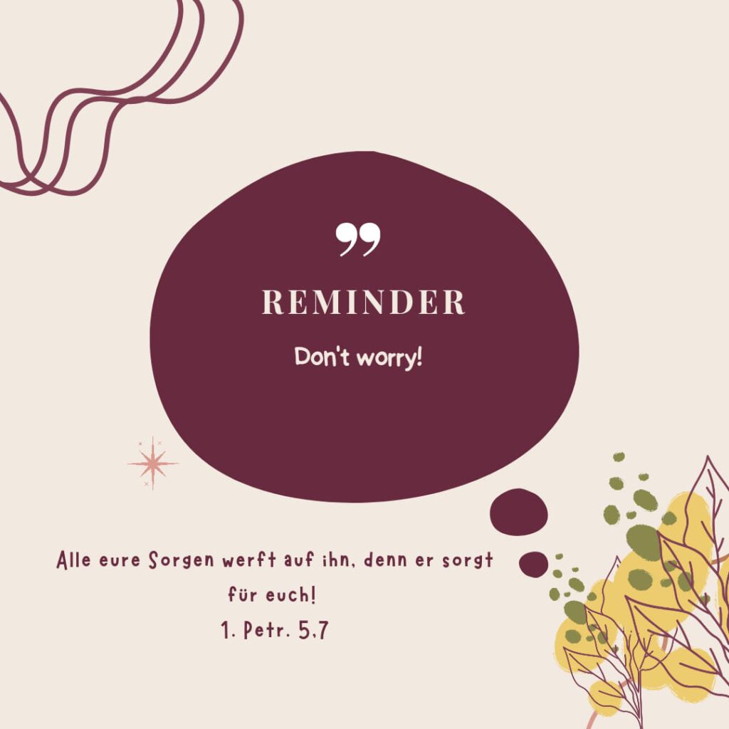 Das Geniale ist aber: Der Spruch über dieser Woche sagt nicht (nur): „Sorgt euch nicht!“, weil Gott weiß, dass dies nicht in unserer Hand liegt. Sondern er bietet direkt eine Lösung an: „Wenn ihr euch sorgt, gebt sie mir ab und ich sorge für euch!“. Ich kümmere mich. Ich sehe dich. Ich höre dir zu. Ich halte dich. Ich kann es nicht immer ändern aber ich bin da. Gott sagt in diesem Spruch nicht: „Sorgt euch nicht.“ Sondern er sagt: