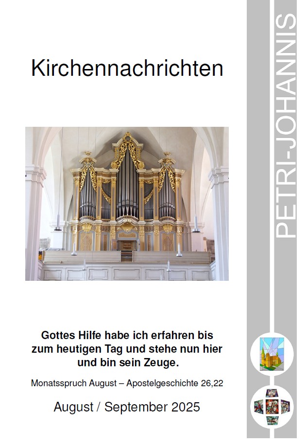 Die Kirchennachrichten für August und September sind da! Wir lesen über besondere Gottesdienste, zum Gemeindefest mit dem Schulanfang, zum Abschluss der Kinderkathedrale, zum Kulturkirchenfest (in Chemnitz), Kirche im Kino, und, und, und. Nach der Sommerpause finden sich wieder zahlreiche und vielfältige Konzerte und Veranstaltungen; besonders hinweisen möchte ich auf die Silbermanntage und die Vernissage mit Arbeiten von Sigmar Cholet.