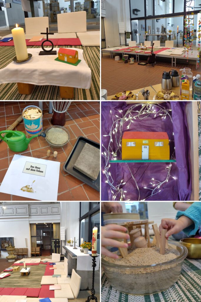 In unserer Schatzkiste lag ein kleines Haus, welches an diesem Sonntag neben dem Kreuz und der Kerze unseren Mini-Altar schmückte. Wir sangen von Gottes großer Liebe und blickten dabei nach ganz oben in den Kirchenraum. Danach ertönte unsere kleine Klangschale…und brachte die heutige Geschichte mit. Staunend betrachteten die Kleinsten die großen Bilder. Begeistert trommelten sie, als der Regen kam. Wir bauten zwei Häuser. Eines auf Sand und eines auf Stein und ließen den Regen darüber fließen. Stille lag in der Luft, so gespannt waren unsere kleinen Gottesdienstbesucher:innen auf das was nun passiert. Zum Abschluss sangen wir „Bau nicht dein Haus auf losen Sand“ und beteten das Vater Unser. Mit Kaffee und Kuchen wurde anschließend noch weiter gebaut, gematscht, gelacht und die letzten Züge der Kinderkathedrale genossen.